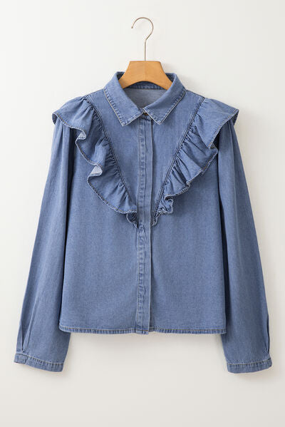 Lacey Ruffled Collared Neck Long Sleeve Denim Top