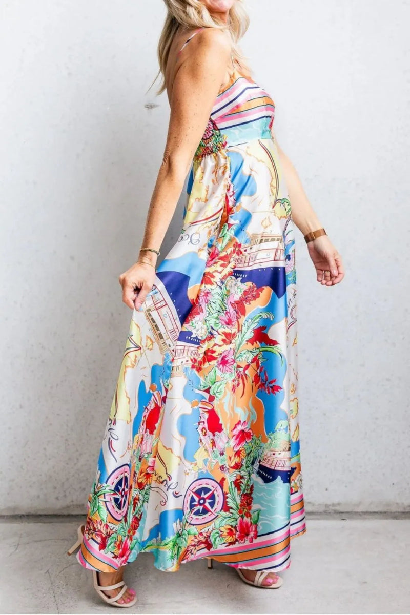 Jacquelyn Smocked Back Printed Square Neck Maxi Cami Dress with Pockets