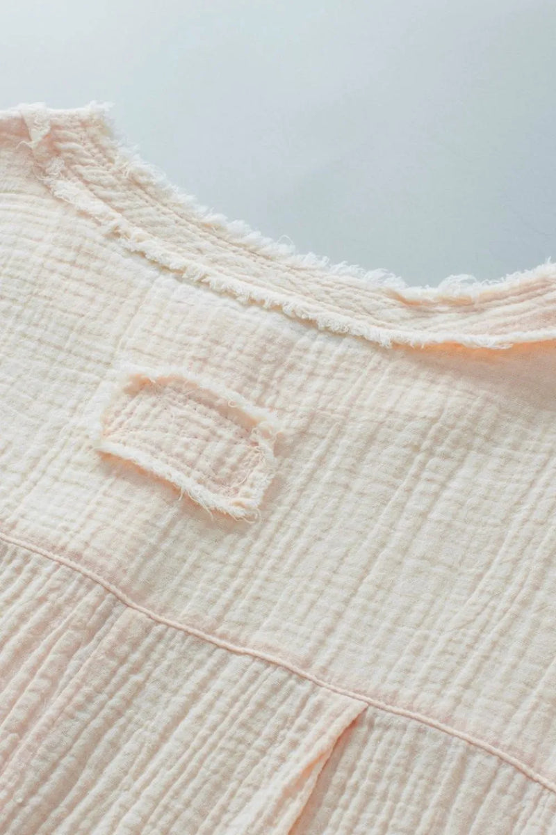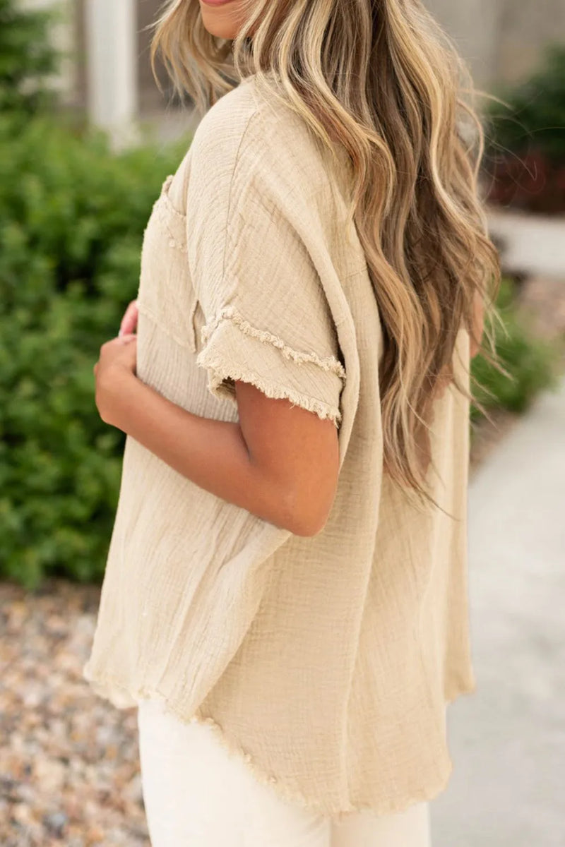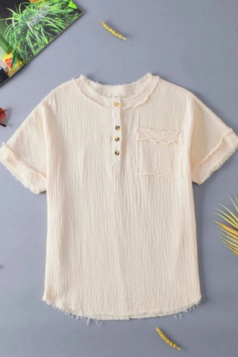 Robyn Textured Frayed Trim Half Button Short Sleeve Top
