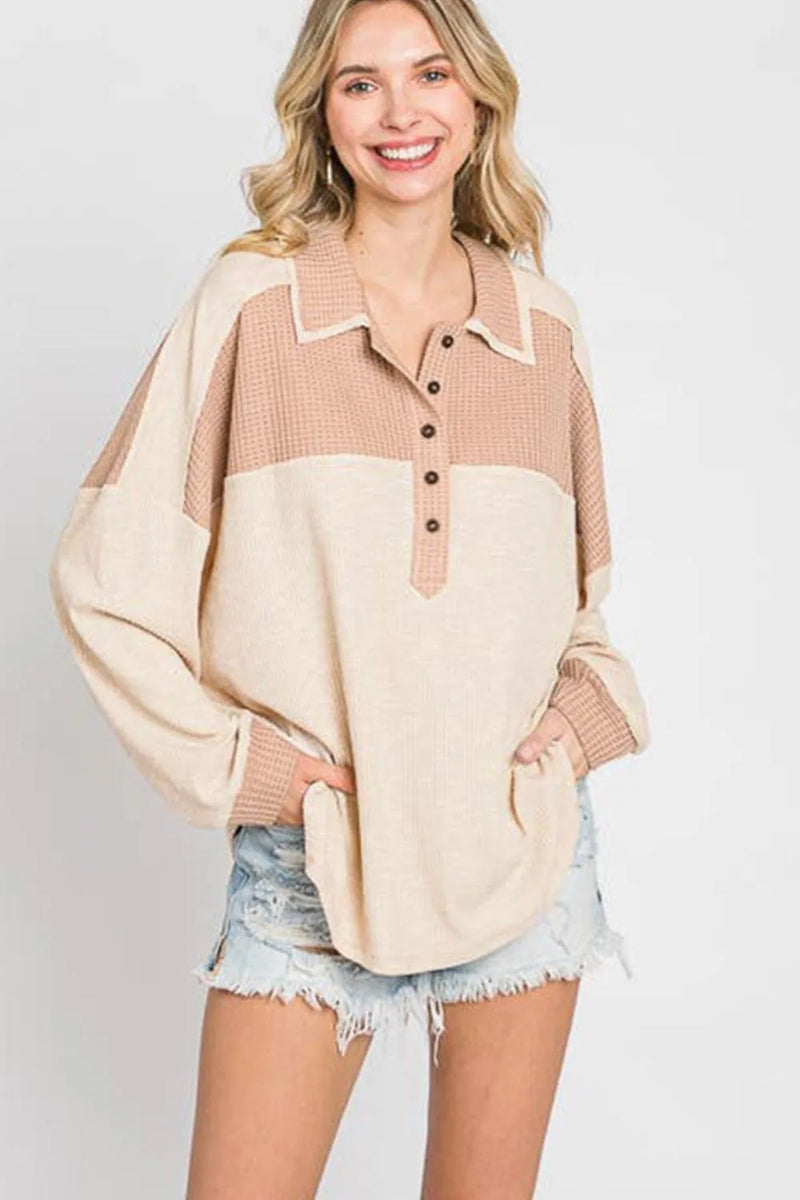 Eleanora Waffle-Knit Color Block Half Button Long Sleeve Top