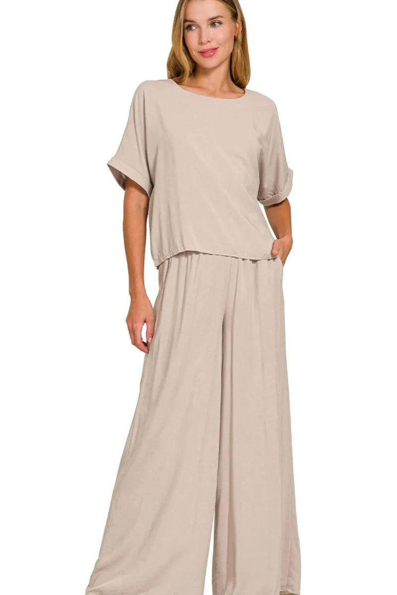 Verity Zenana Round Neck T-Shirt and Wide Leg Pants Set